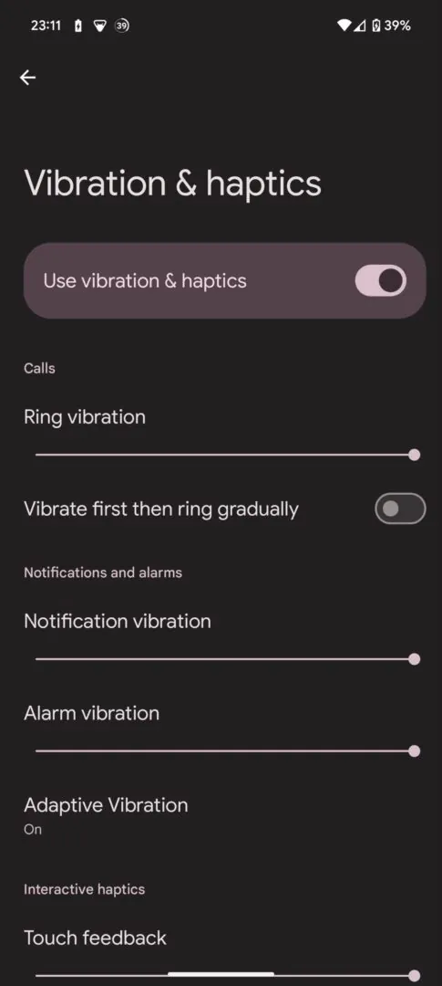 Android 15 auf Pixel-Geräten enthält eine neue Einstellung für die adaptive Vibration. Die adaptive Vibration passt die Vibrationsstärke automatisch an die Umgebung an. Dazu werden das Mikrofon und andere Sensoren des Telefons verwendet, um den Geräuschpegel und den Kontext zu ermitteln. Um die Privatsphäre zu schützen, werden keine Daten aufgezeichnet.