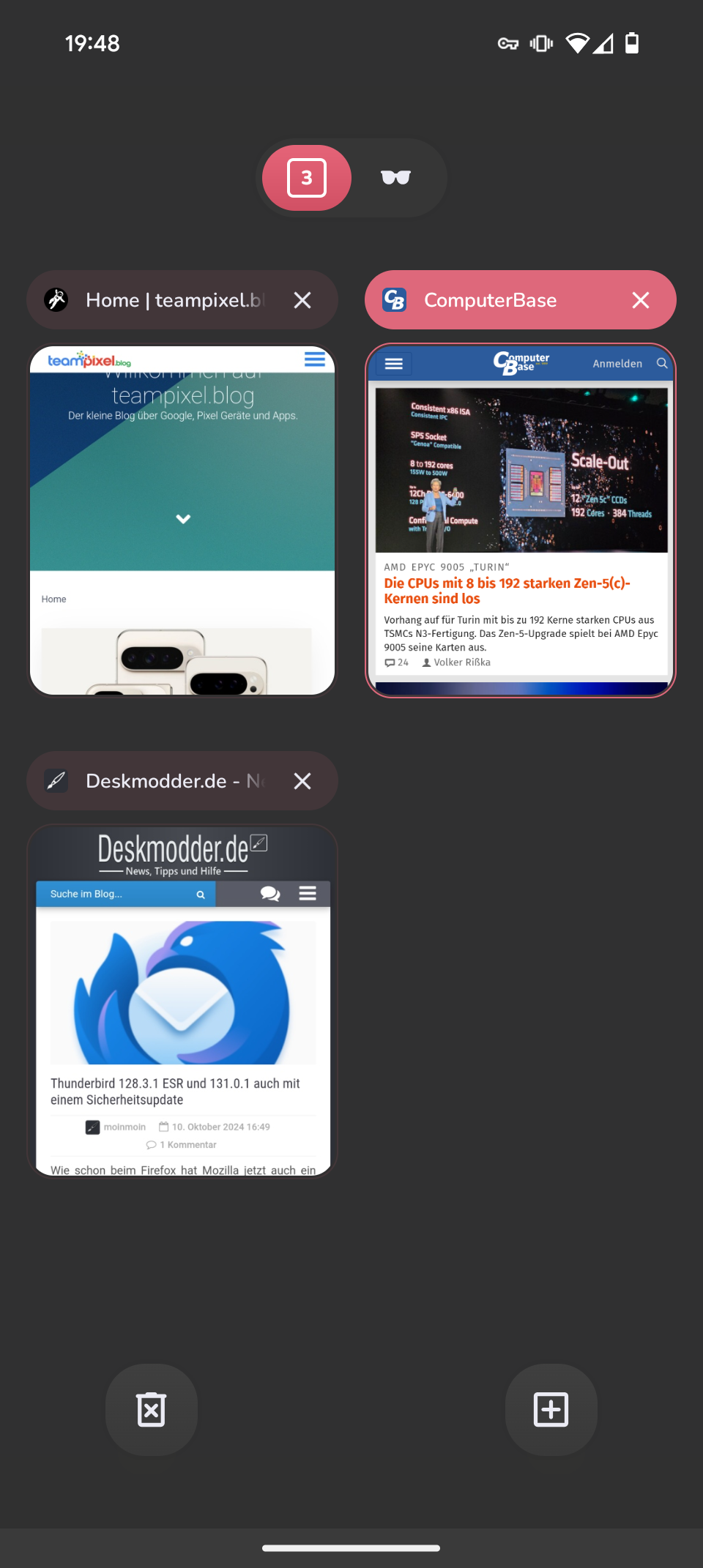 Besonders gut gefällt mir die Bedienung des Browsers. Diese orientiert sich sehr an Safari für iOS, die URL-Bar befindet sich am unteren Bildschirmrand. Hat man mehrere Tabs geöffnet, kann man schnell zwischen ihnen wechseln, indem man nach links oder rechts wischt. Wischt man nach oben, erhält man eine Übersicht aller Tabs.