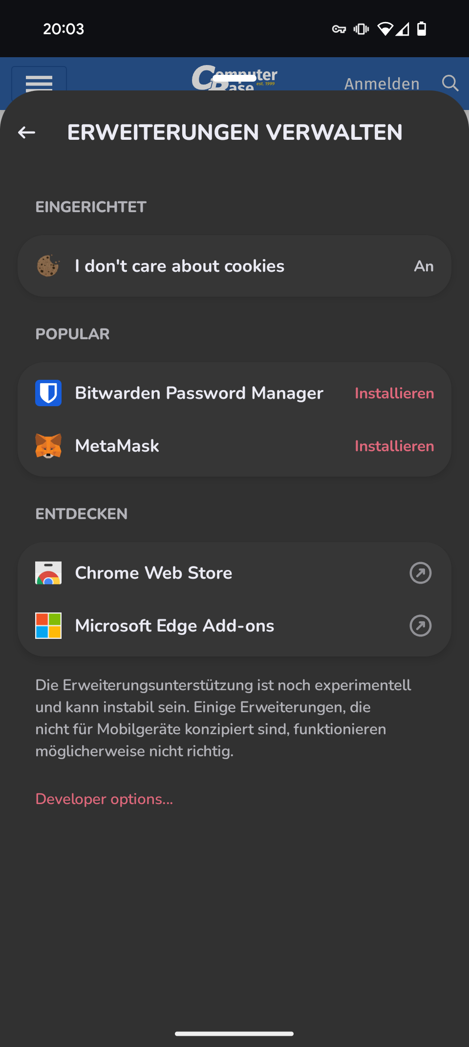 Neben der benutzerfreundlichen Bedienung punktet der Browser auch mit seiner Kompatibilität zu Erweiterungen. So kann man die meisten seiner Lieblingserweiterungen auch auf dem Smartphone nutzen, allerdings werden vermutlich nicht alle funktionieren. Ich habe zum Beispiel Bitwarden getestet, und es funktioniert tatsächlich sehr gut.